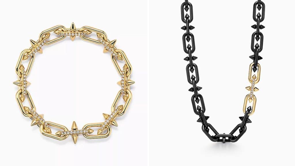 The collection features 19 pieces with a selection of accessories such as necklaces, bracelets, earrings, and rings. Crafted with Tiffany&Co.’s renowned attention to detail, these creations are available in 18k yellow gold and titanium, offering a blend of metal and diamond embellishments in distinct shapes. One of the standout features seen across the collection is the use of sharp, spear-like spikes that evoke a sense of punk spirit in pieces. Through this sort of innovative design and intricate craftsmanship, the range aims to rethink contemporary jewellery.