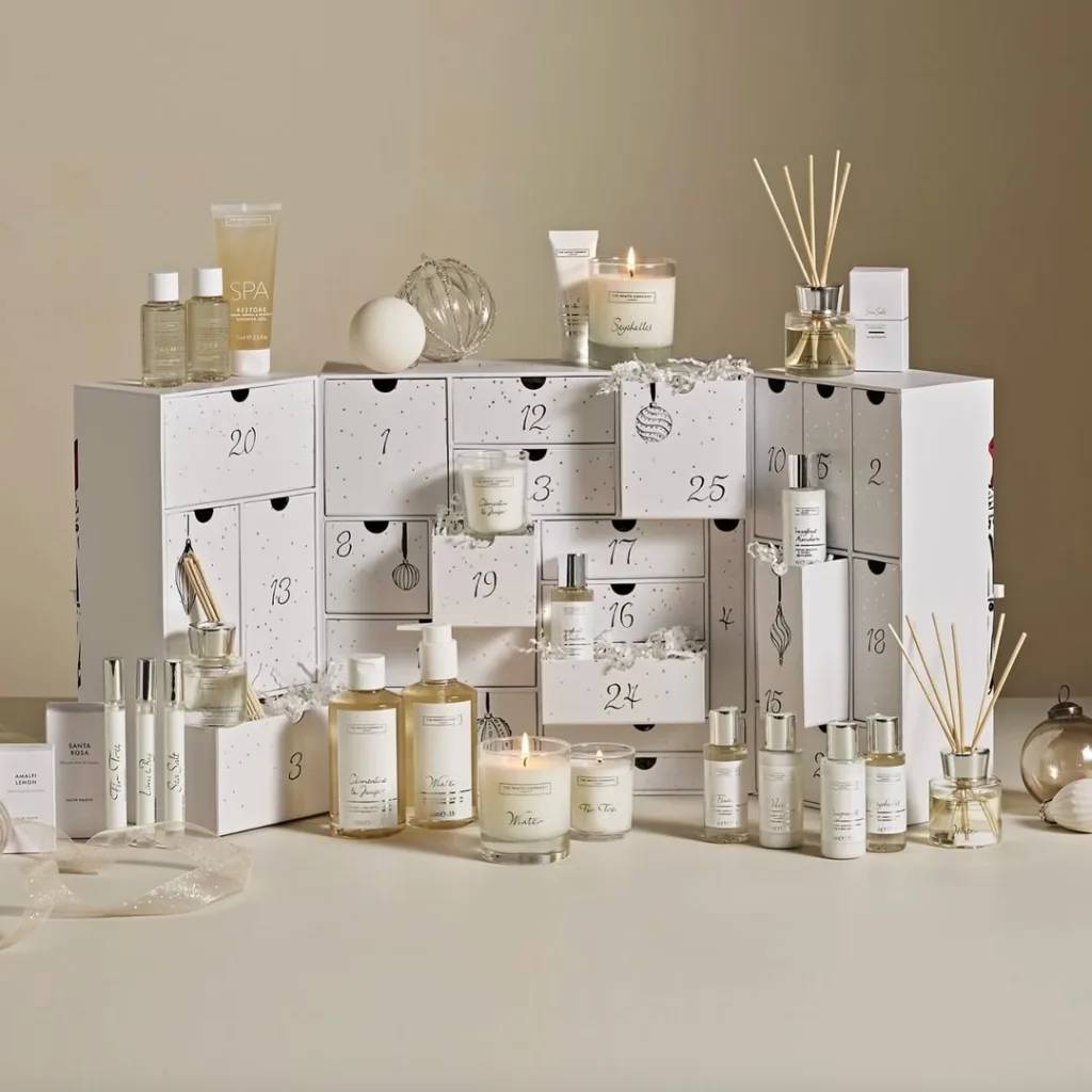 The White Company’s advent calendar is a rarity, as it includes sophisticated home treats alongside body and fragrant focus delights. Inside you’ll find a mix of full and travel‑sized items such as their Winter Signature Candle, Seychelles Candle, Santa Rosa Eau de Toilette, and Clementine & Juniper Bath & Shower Gel, along with smaller treasures such as hand creams, mini diffusers and reeds, home sprays, and body washes. The calendar strikes the perfect balance of seasonal scents with daily luxury products, making it a thoughtful choice for someone who values comfort, ambiance and elite self‑care.