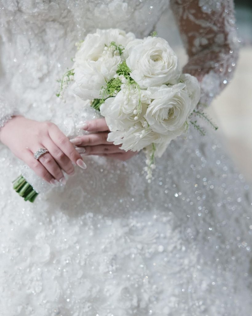 For flowers, she opted for a simple white rose bouquet by Philocaly. From the bridal look to the