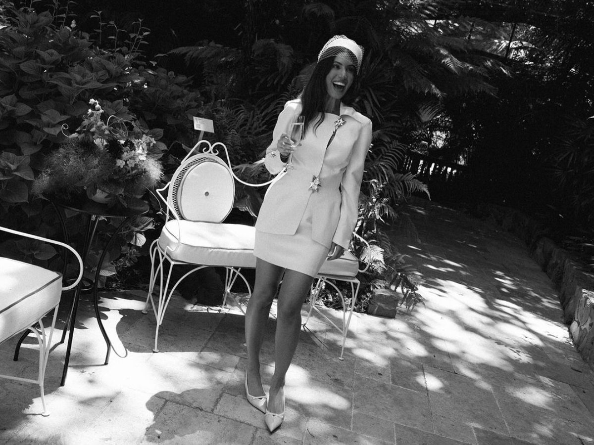 On her special day, Tania Sarin chose a vintage archival Thierry Mugler Couture set from 1985 – a cute white suit adorned with silver accents. She elevated her ensemble with a chic hat by Gladys Tamez, crafted from white straw with a gold veil. She completed the look with Jimmy Choo kitten heels and Bulgari earrings, adding an extra layer of grace and elegance.