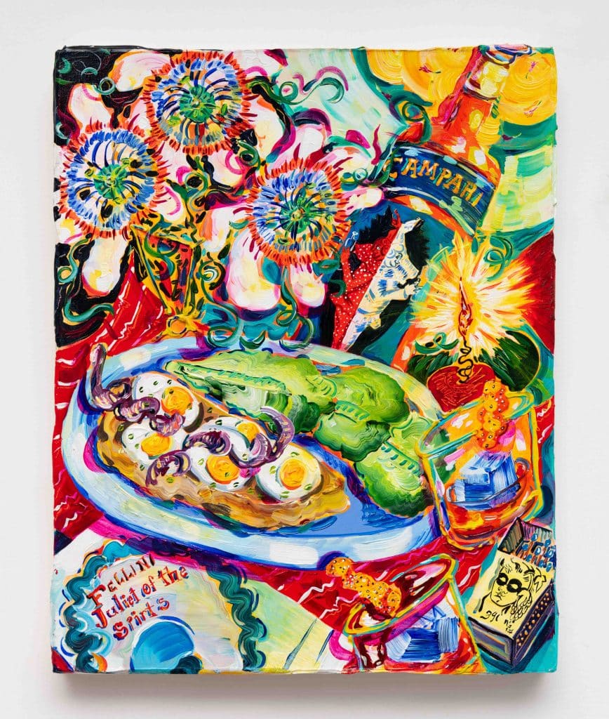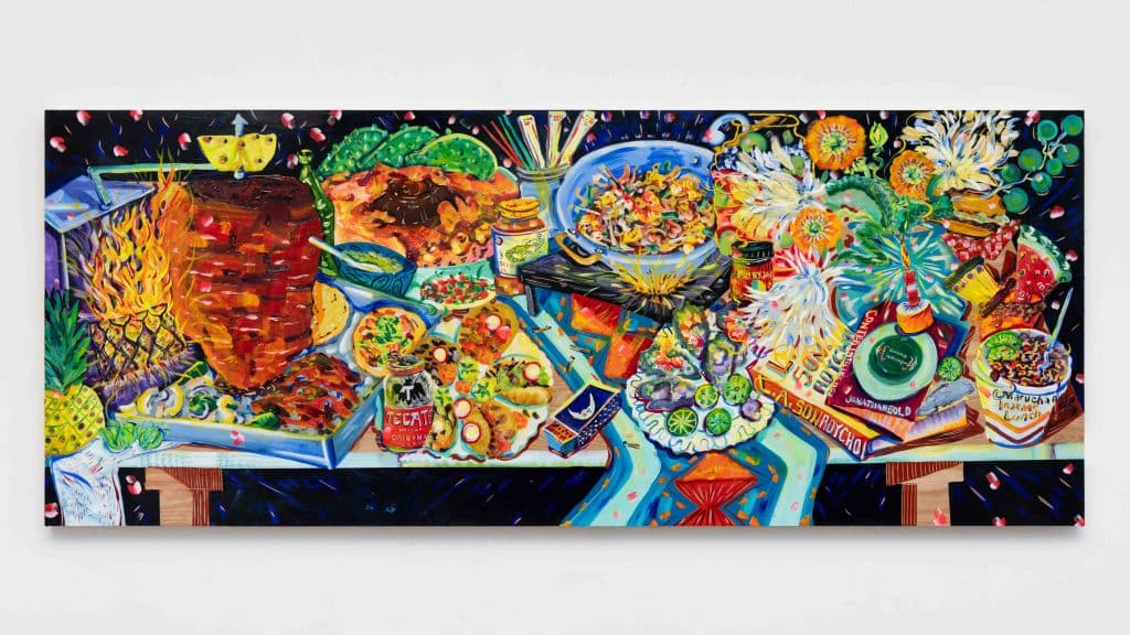 Through painting Kate asked, “We all must eat. How do the objects we consume and surround ourselves become a part of our cultural and psychological understanding of self? Through reimagining the radical storytelling power of food, I paint the theater of the dinner table. Synthesizing contemporary life and mythology, I map culture, place, and self through the objects we consume; viewing the table-scape as a stage and commons. Deeply invested in the duality of the sacred and profane, my paintings act as hermeneutic diagrams of narrative and communication: creating meaningful and nuanced connections between the object identity of things that fill our everyday lives and their associative psychological, historical, and narrative power. I view the tablescape as a place of narrative portraiture. Sometimes the table acts as a shrine, other times a commons or a stage.”