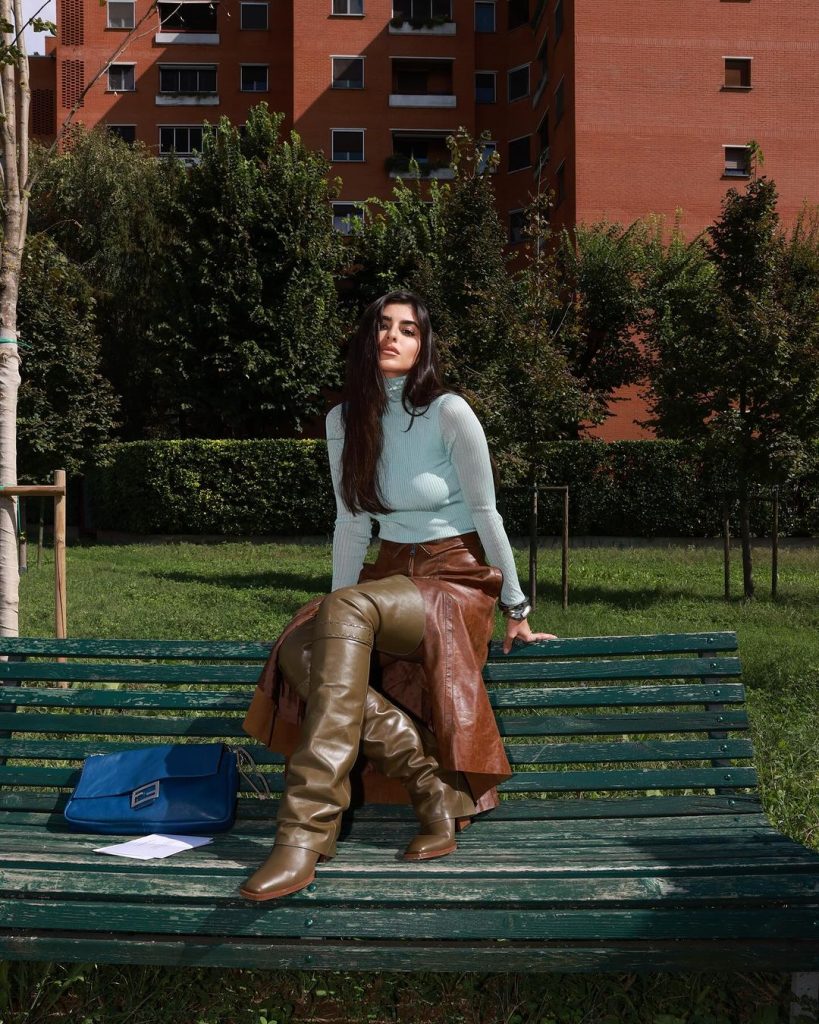 The Egyptian blogger made a stylish appearance in a khaki and grey dress, complemented by knee high brown boots for the Fendi show.