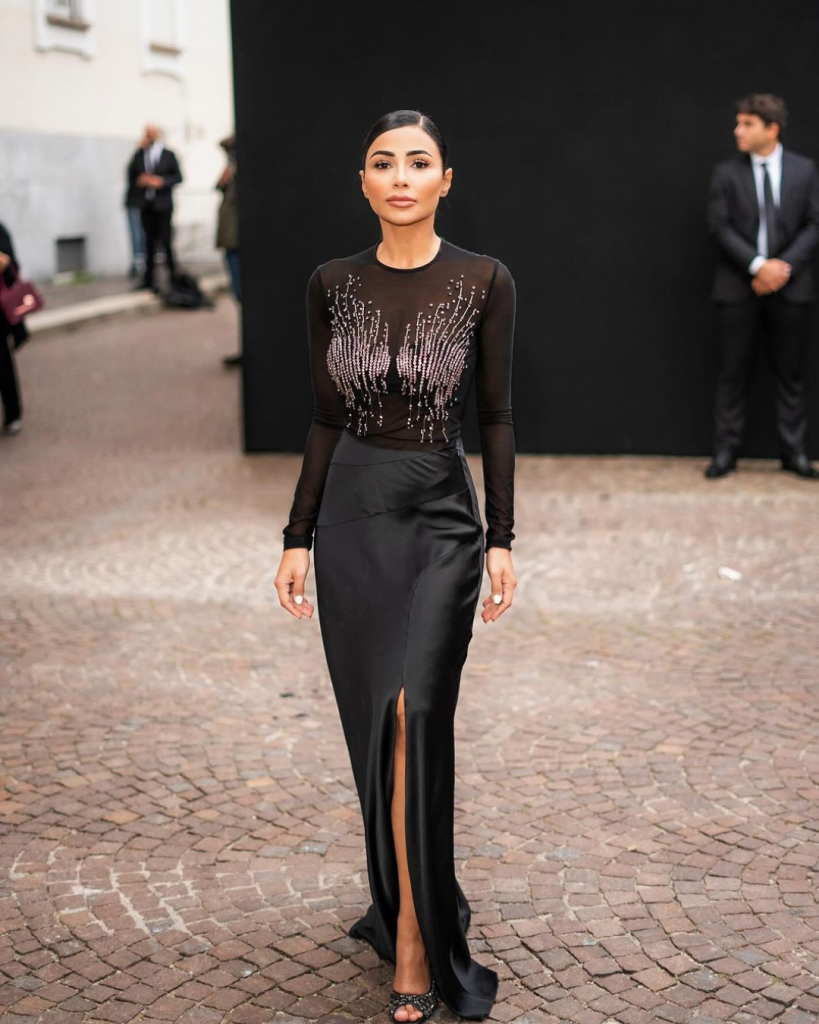 The Emirati television presenter and actress exuded elegance in a black gown featuring a high slit and crystal embellishments at the Alberta Ferretti show.