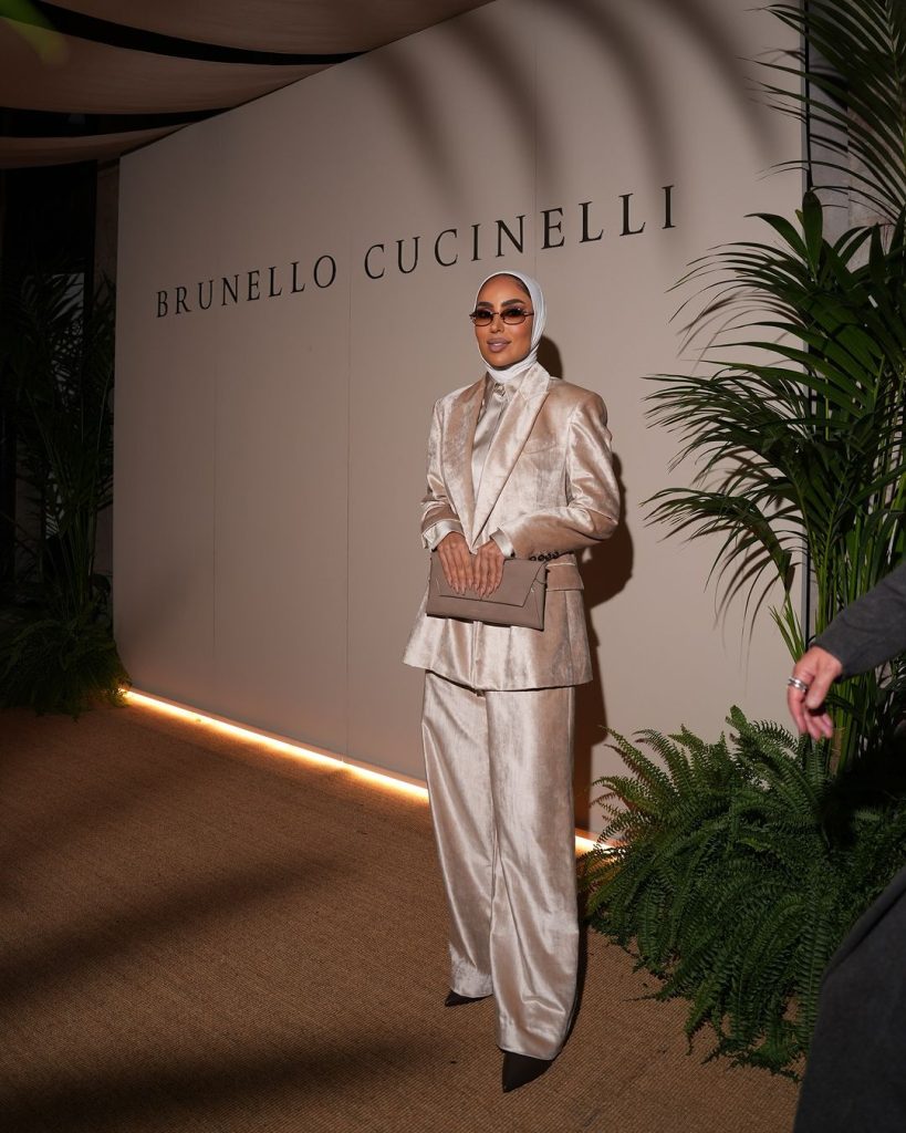While attending the Brunello Cucinelli S/S 25 Women’s collection presentation, the Kuiwaiti style icon brought her signature glamorous, modest style in a chic suit.