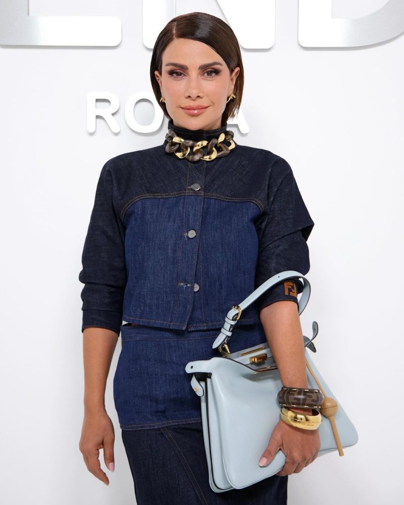 The Jordanian actress and film producer turned heads at Fendi’s Spring/Summer 2025 show in a two-piece denim ensemble, paired with gold and monogram accessories, and a powder blue Peekaboo bag.