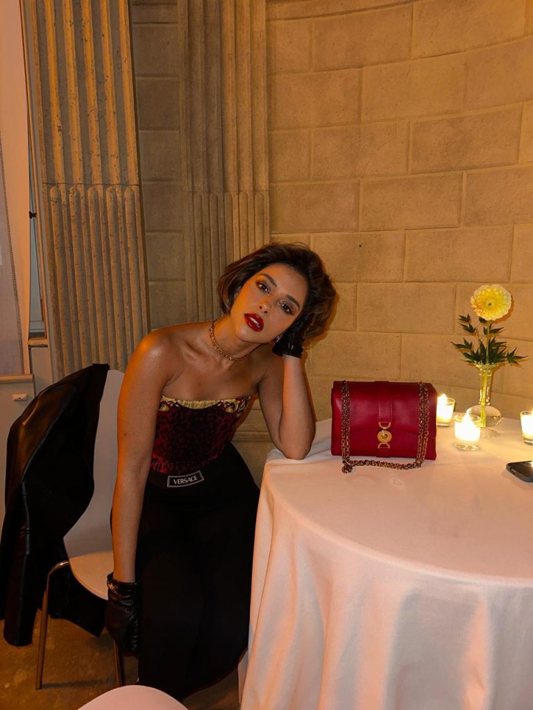 Award-winning singer Balqees was a vision in a burgundy bustier top, black pants, leather gloves and a chic gold chain choker at Versace’s Spring/Summer 2025 after party. Styled by Cedric Haddad, she accessorised the look with the Italian fashion brand’s Kleio bag.