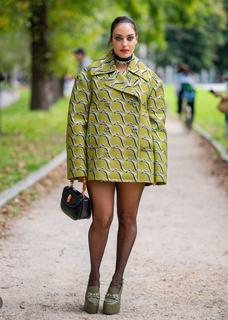 The Lebanese fashion blogger sported a full Gucci look attending the Spring/Summer 2025 show – dressed in an oversized green jacket with matching platform heels, accompanied by a black mini bag.