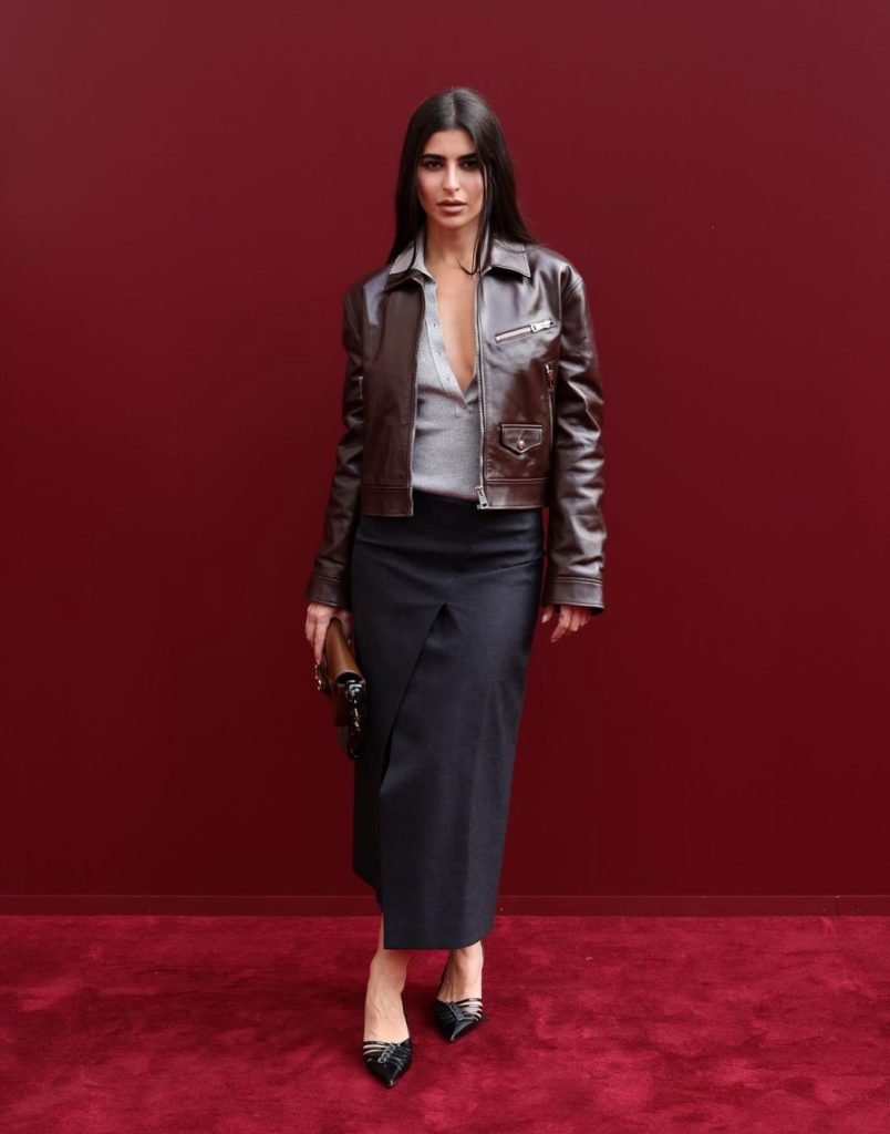 The Dubai based influencer with an esteemed following, stepped out to the Gucci Spring/Summer 2025 show in style, wearing a black maxi skirt and a chic brown leather jacket – paired with a matching bag.