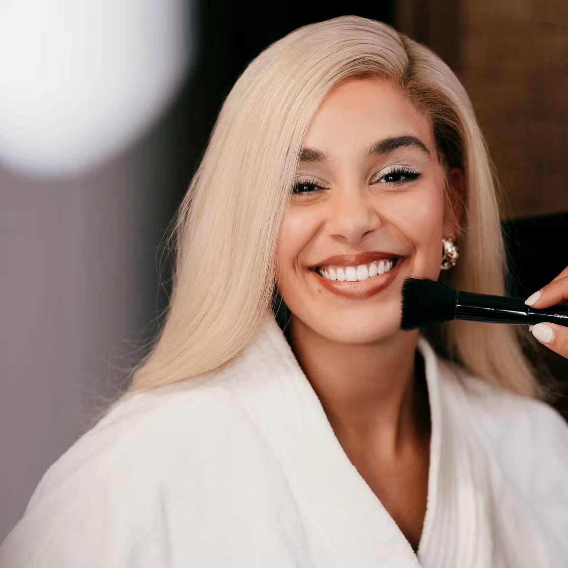 “[I’ve given Smith] soft radiant skin paired with an overlined glossy nude lip and silver shimmering eyeshadow for an effortless glow,” she tells me. “It’s modern glamour, with a playful twist.”
