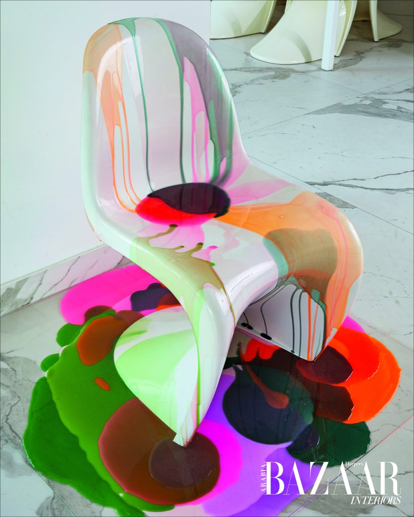 Nat lives with her husband and daughter, and has made home to be a place that nourishes both her creativity and family life. “We make time for family moments, and I try to maintain a balance between my art, my personal time, and the time I spend with them,” she says. The furniture comes from a mix of international designers and local artisans. The statement white Yamaha piano is the only item shipped from the UK during Nat’s move to Dubai. The artist reveals her love for customising furniture to make it completely her own – for instance, she painted the Panton chair herself with resin.