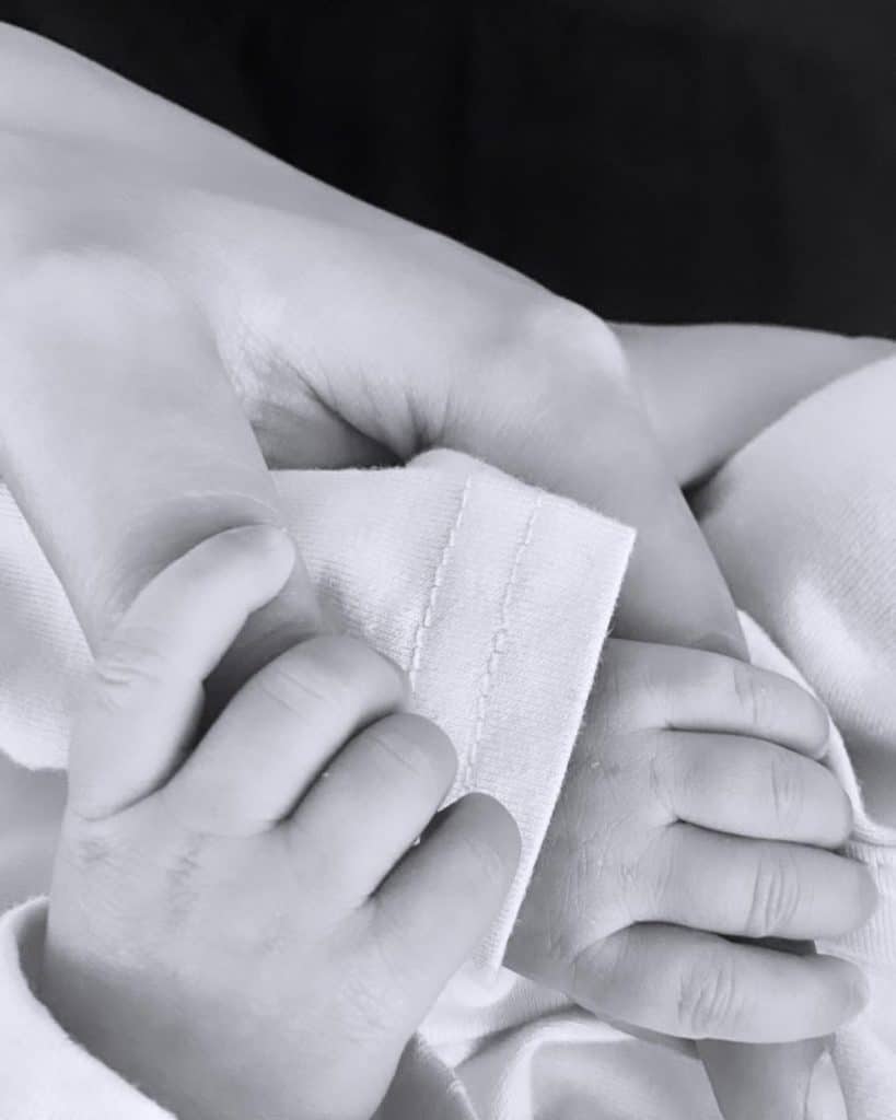 A sweet image of black and white image of baby Mahra holding her mother’s fingers was also released: