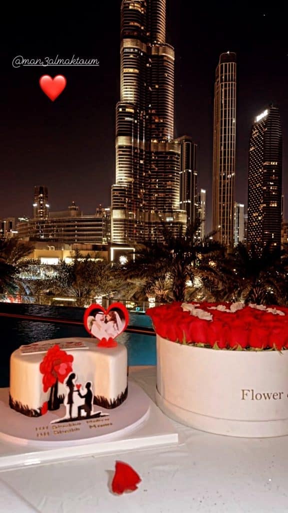 The couple also appeared to be celebrating the anniversary of their engagement, as Sheikha Mahra shared a photo of a cake, which boasts a cut out of a man down on one knee proposing to his sweetheart, next to a lush bouquet of red and white roses.