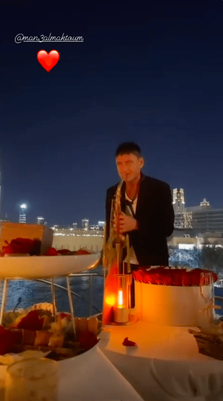 With breathtaking views of the Dubai skyline in the background and a Saxophone player serenading the pair with a rendition of Careless Whisper.