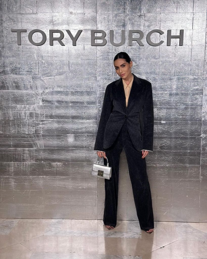 TV presenter Diala Makki looked dapper at Tory Burch. The Dubai-based media personality wore a shimmery black corduroy suit to the showcase. She finished off the look with slicked back hair and a silver clutch. She also attended the Carolina Herrera showcase and can be seen wearing a lace, periwinkle blue gown and matching blazer to Michael Kors in a few images posted on IG Stories.