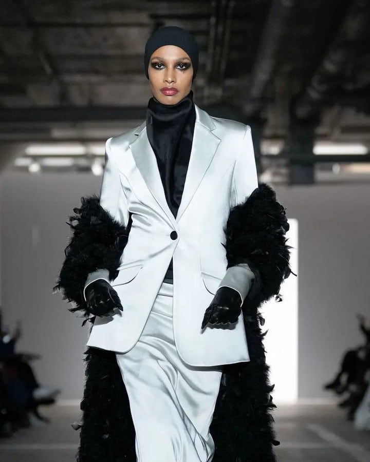 Hijabi model Ikram Abdi Omar looked fierce on the catwalk of Prabal Gurung. The Harper’s Bazaar Arabia cover star stunned in a baby blue power suit, feathered coat, black gloves and a black headpiece.