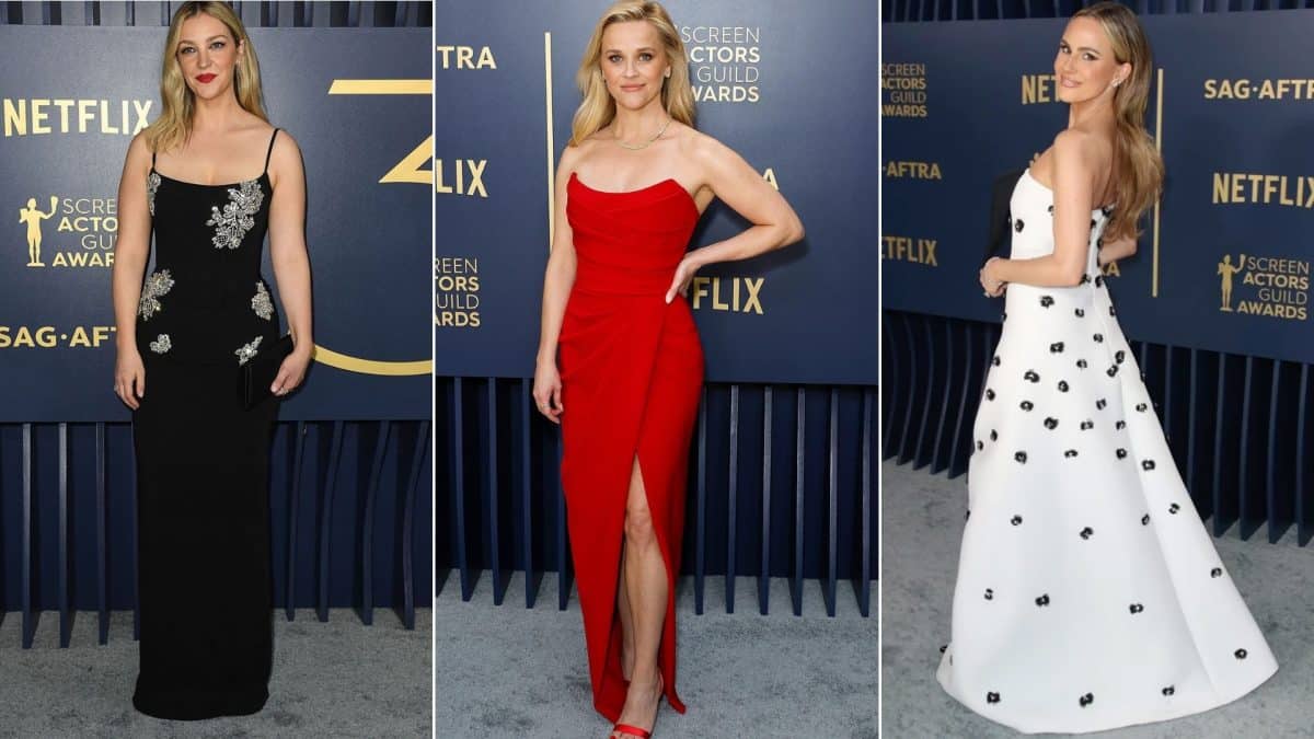 Hollywood actor Reese Witherspoon went with a bright red look, wearing a long gown with a draped bodice and dramatic thigh-high slit from Lebanese designer Elie Saab’s spring 2024 haute couture collection. She styled the dress with a pair of Gianvito Rossi strappy heeled sandals.