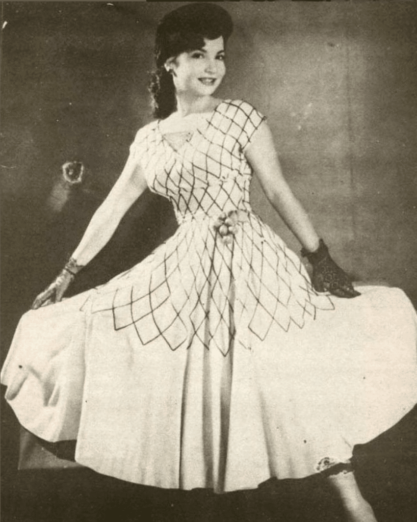 Receiving the well-earned sobriquet “The Lady of the Arab Screen,” the iconic Egyptian actor Faten Hamam graced a 1956 awards ceremony with charm. During the event, she was presented with The Elegance Award and accepted it in a timeless classic: a little black dress adorned with delicate bead work. Known for her sophisticated taste in fashion, Faten favoured styles that embraced sharp cuts and a playful juxtapositions of patterns.