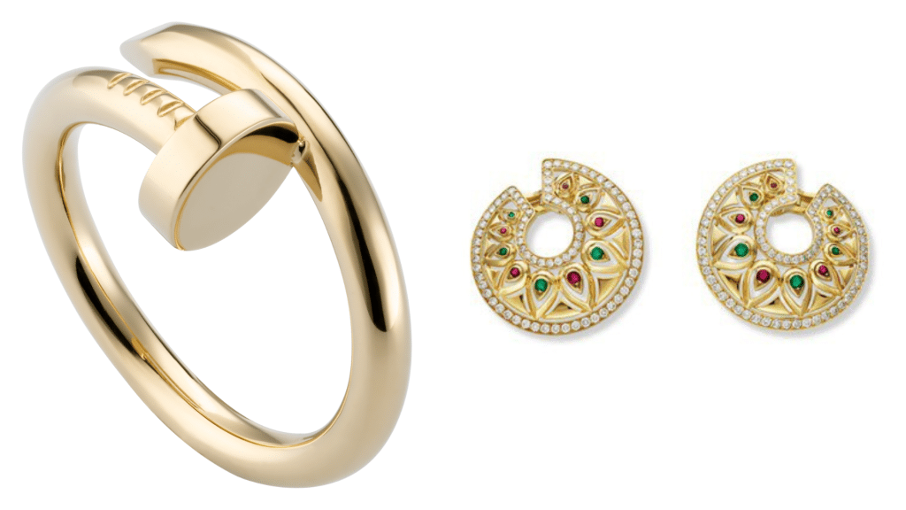 Adding a touch of sparkle, she accessorised with Cartier Collection earrings in 18k yellow gold adorned with diamonds and emeralds, alongside their Juste Un Clou ring. These pieces lent a timeless elegance to her modern look.