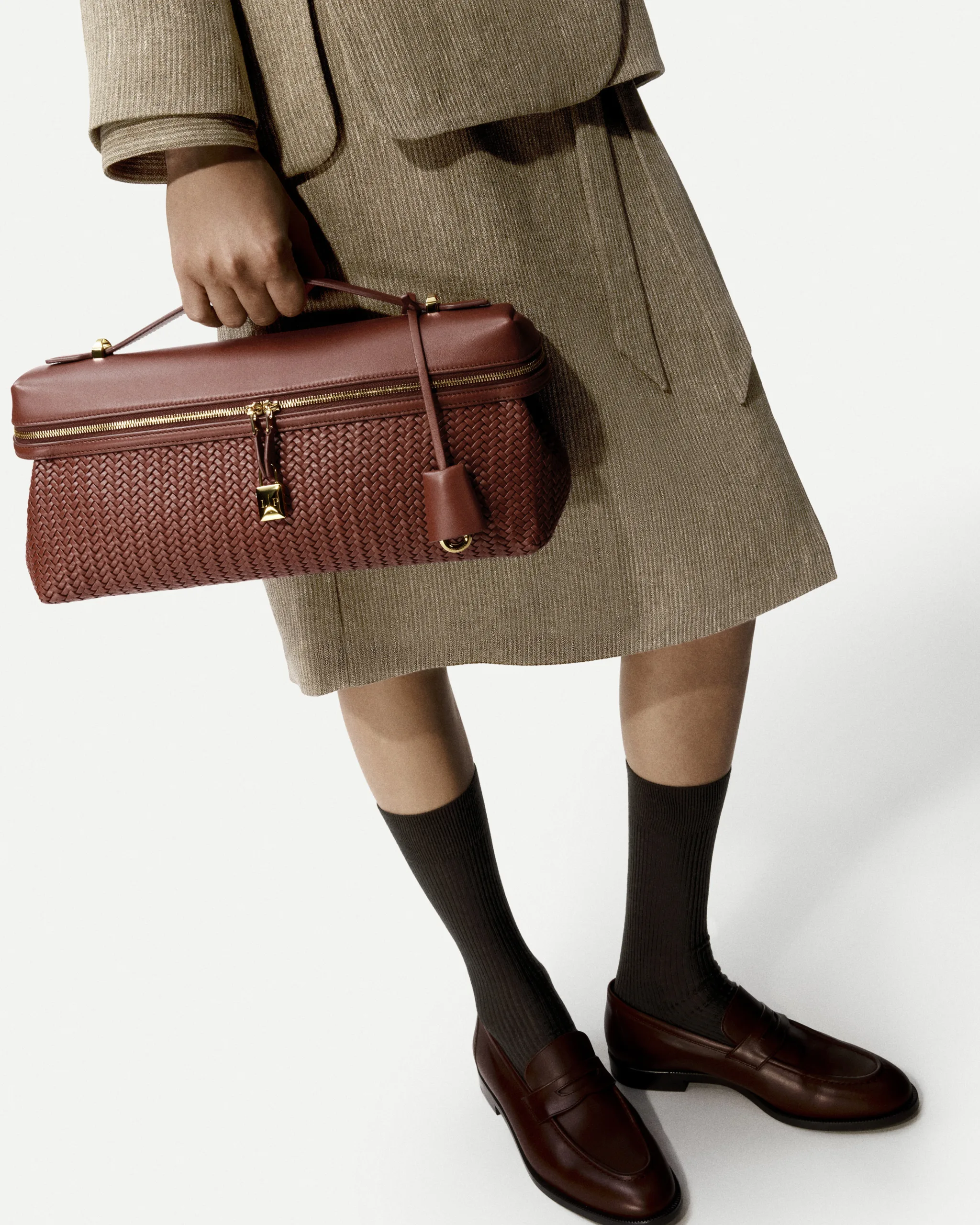 The piece also features a vintage-style leather keyring with the Ghiera charm. Meanwhile, the adjustable and fully detachable strap allows the bag to be worn on the shoulder or across the body. The strap is attached using a bridge hook inspired by the curve of the handle. Securing the wide zip opening is the brand’s signature gold three-dimensional padlock, engraved with the Loro Piana initials.