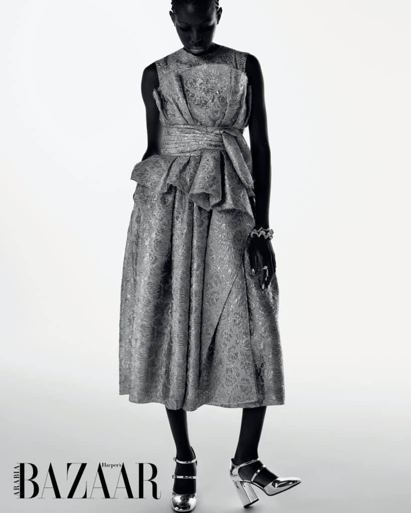 Skirt worn as headpiece, Dhs7,005; Top, Dhs7,005, both RabanneDress, POA, Erdem. Shoes, Dhs955, Max&Co. From top: Bracelet, Dhs20,000; Bracelet, Dhs 25,000, both Amwaj Jewellery. Ring, POA, Yeprem at Al Fardan Jewellery Abu Dhabi