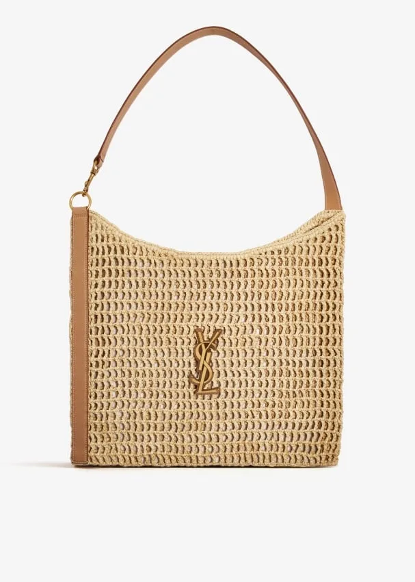 Saint Laurent’s Oxalis shoulder bag blends artisanal craftsmanship with a minimalist silhouette, featuring a hand-crocheted mesh design, vegetable-tanned leather trim, and the iconic bronze-tone Cassandre, perfect for elevating any vacation look.