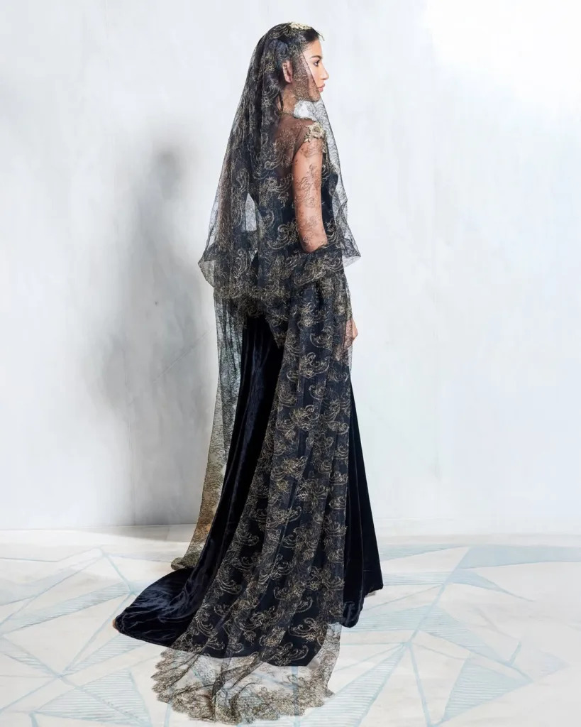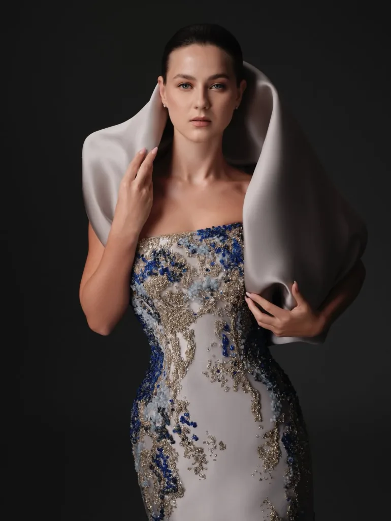 Riyadh-based Atelier Hekayet crafts eveningwear that leans into romance and drama, where intricate embroidery and handcrafted detail take centre stage. Hekyet’s pieces have found their place on red carpets and high-profile appearances, chosen for their ability to balance femininity with high-impact opulence.