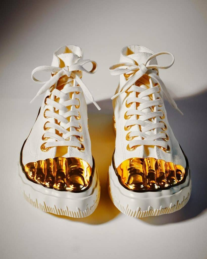 The sneaker features a timeless high-top canvas design (reminiscent of the classic Converse Chuck Taylor), adorned with quintessentially Daniel Roseberry touches: golden trompe l’oeil toes, Schiaparelli’s signature measuring tape motif that wraps around the edges of the sole, gilded eyelets, and a trompe l’oeil footprint emblazoned underneath the shoe.