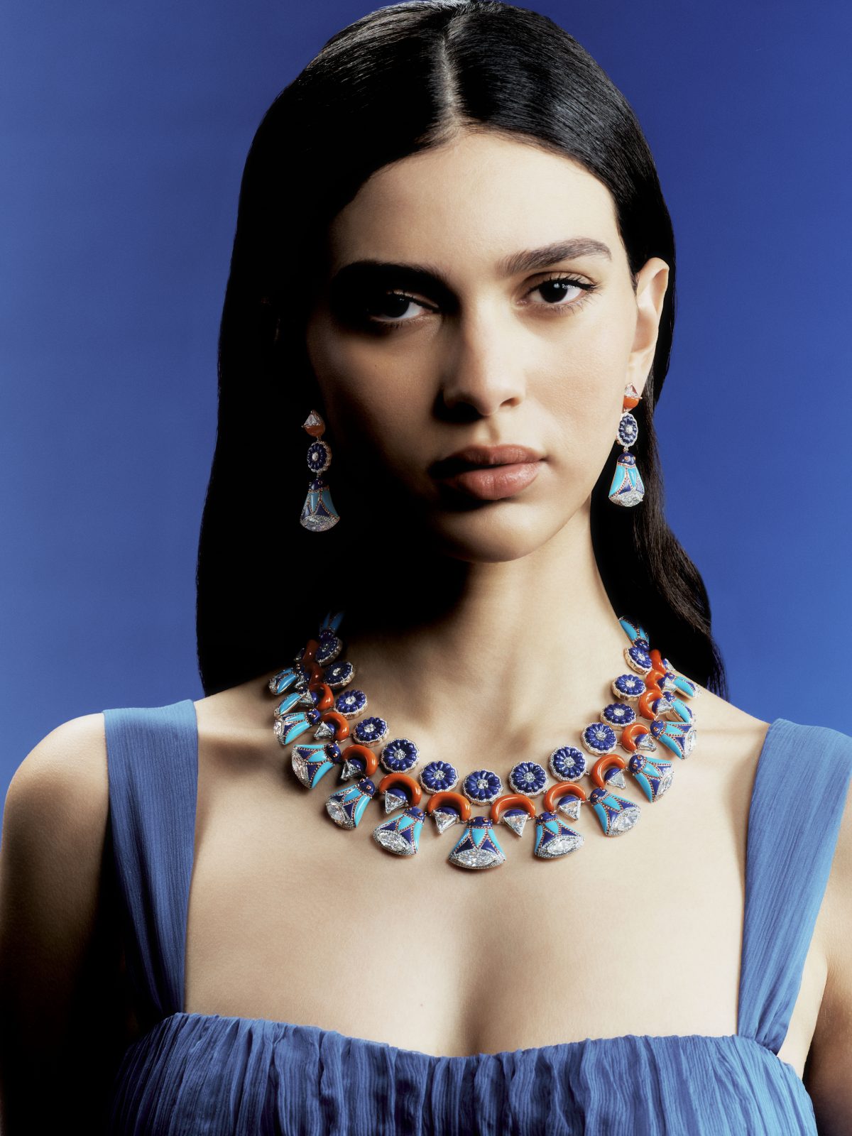 Meanwhile, a sensational diamond and emerald suite serves as an ode to the city of Amarna, Egypt. The Amarna Palace, constructed by pharaoh Akhenaton in the 14th century BC for his wife Nefertiti, featured a ‘green room’ embellished with geometric papyrus motifs. Its extravagance has inspired the Queen’s Papyrus set, which showcases sumptuous diamonds, emeralds, and jadeite, capturing the stylistic transition that took place during the Amarna period.