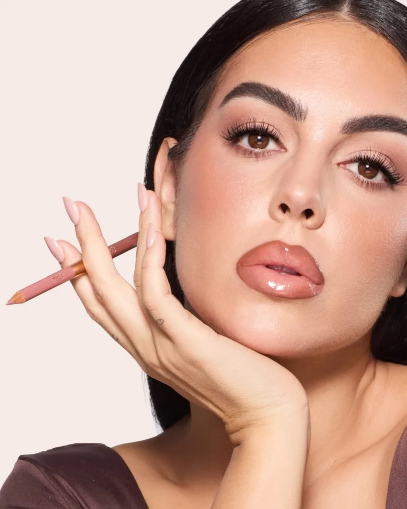 Georgina Rodriguez’s Lip Cheat Duo by Charlotte Tilbury is her go-to. A fan of overlining, she begins by using the darker shade to define and outline her lips, creating a bold, structured shape. Next, she applies the lighter tone in the center of the lips to add dimension and a subtle highlight. She then layers The Super Nudes matte lipstick by Charlotte Tilbury for a smooth, even base. To finish, she tops it off with Charlotte Tilbury’s Big Lip Plumpgasm, giving her lips that perfect plump, luscious finish every time.