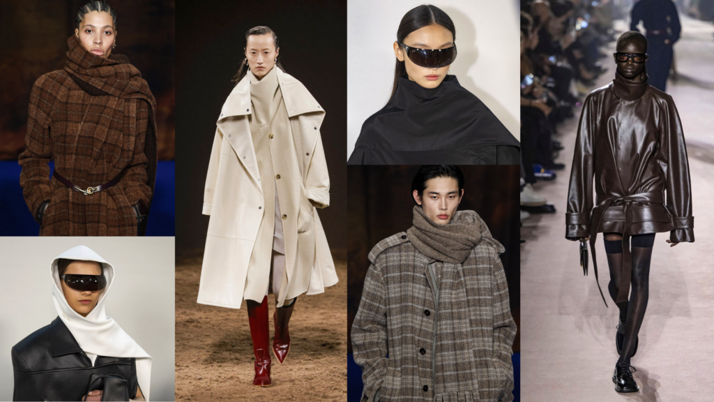 Draped capes appeared at Burberry, Courreges, and Brandon Maxwell, bringing movement and elegance that make layering easy.