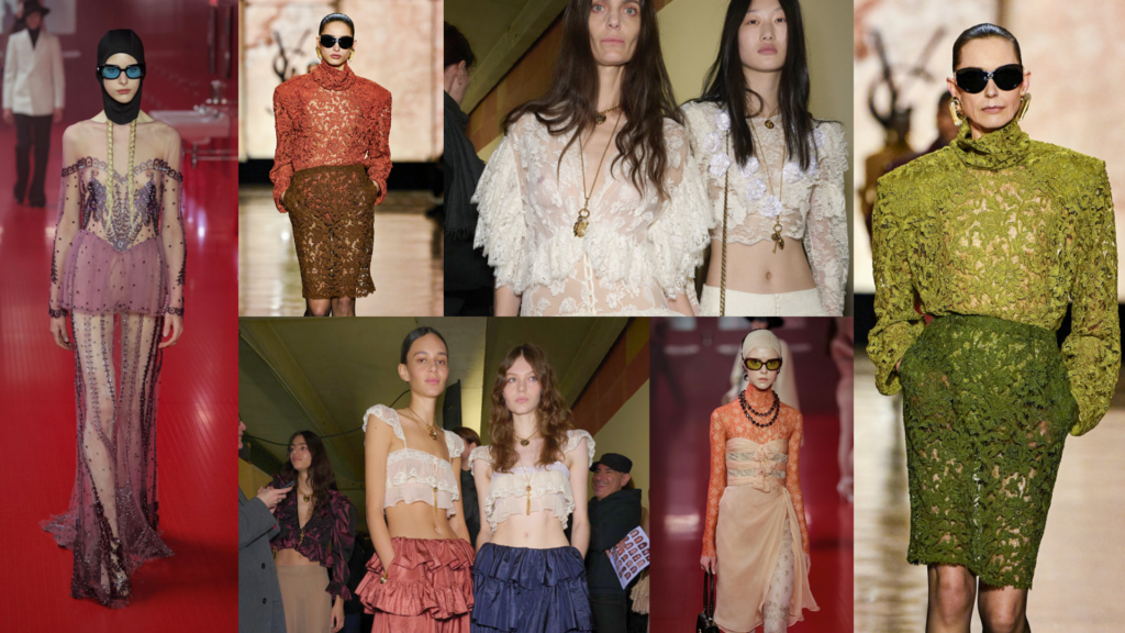 Lace and lingerie-inspired dressing joined the opulent mix, with sheer fabric details at Valentino, Chloé, and Saint Laurent. The red carpet is already embracing the look, but for everyday, layering lace under tailoring or pairing a sheer blouse with denim is a more approachable nod to the trend.