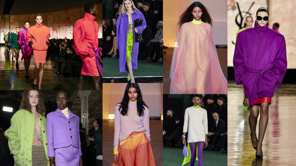 The season’s colour palette proved to be loud, playful, and deliberately unrestrained. Bold shades took centre stage, from neon blocking at Saint Laurent and Gucci to saturated brights at MSGM. Designers leaned into excess with intent, showing that colour can be both powerful and liberating.