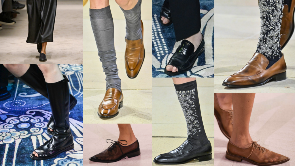 While the clothes leaned towards the seductive, the look was grounded by loafers — styled with knee-high socks and patent finishes. Prada and Miu Miu’s iterations confirmed it: the schoolgirl shoe is the footwear to be seen in this season. And the toe-reigning days aren’t quite over yet, with versions appearing in sheer materials and even open-toed designs.