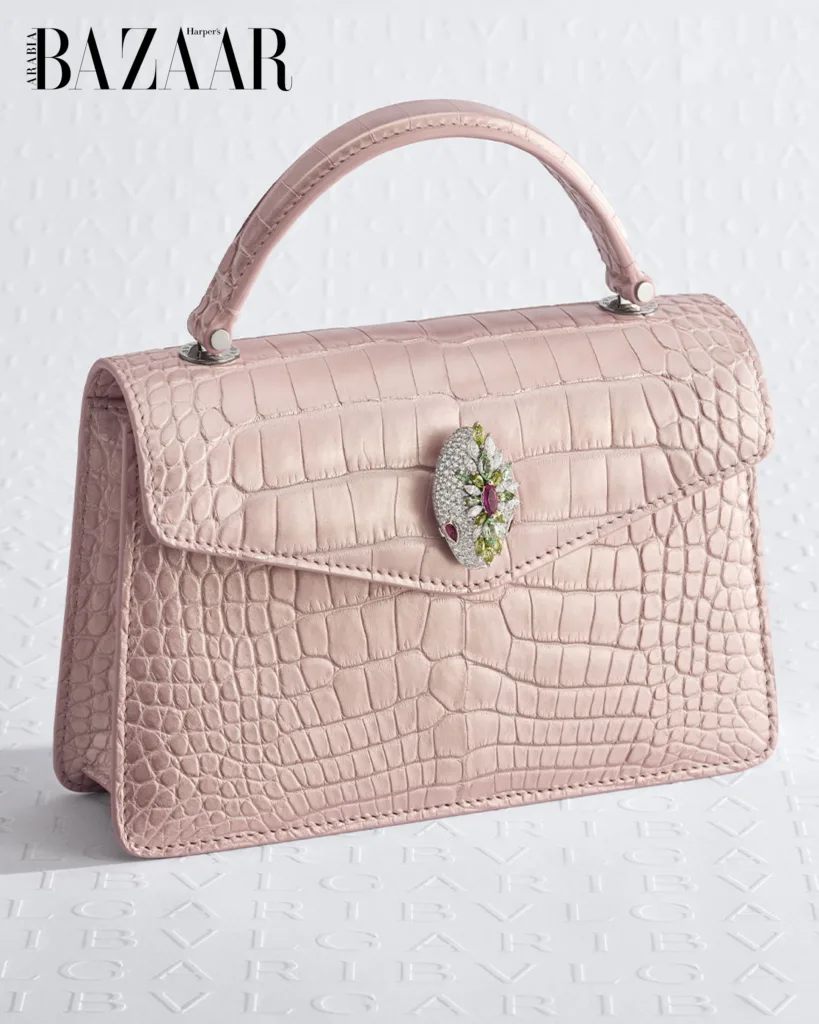 Just as Buonamassa Stigliani translates Bvlgari’s signature jewels into feats of horology, Accessories Creative Director Mary Katrantzou reimagines them in the form of fashion accessories, pieces that seamlessly join the maison’s Polychroma high jewellery universe, with details that detach and transform into pendants. An elongated trapezoidal clutch in exotic black skin gleams with a golden clasp framing a genuine ancient coin, a nod to Bvlgari’s treasured Monete style. Meanwhile, two top-handle handbags, one in the pastel mint, the other in a soft cherry blossom pink, are crowned with gem-set serpent heads, echoing the house’s iconic Serpenti.