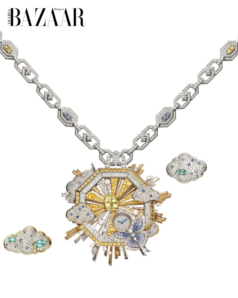 Among the collection’s showstoppers is Nuvole Preziose (“Precious Clouds”), a pendant watch crowned with a 6.88-carat yellow sapphire blazing like a sun. Its golden rays, echoing Gian Lorenzo Bernini’s celestial altarpiece at Rome’s Santa Maria della Vittoria, burst beyond the strict geometry of an octagonal frame, itself a tribute to both the ceiling of the Basilica Maxentius and Octo, Bvlgari’s iconic watch silhouette. An off-centre dial nestles beside a delicate butterfly, surrounded by diamond clouds that detach to be worn as earrings.