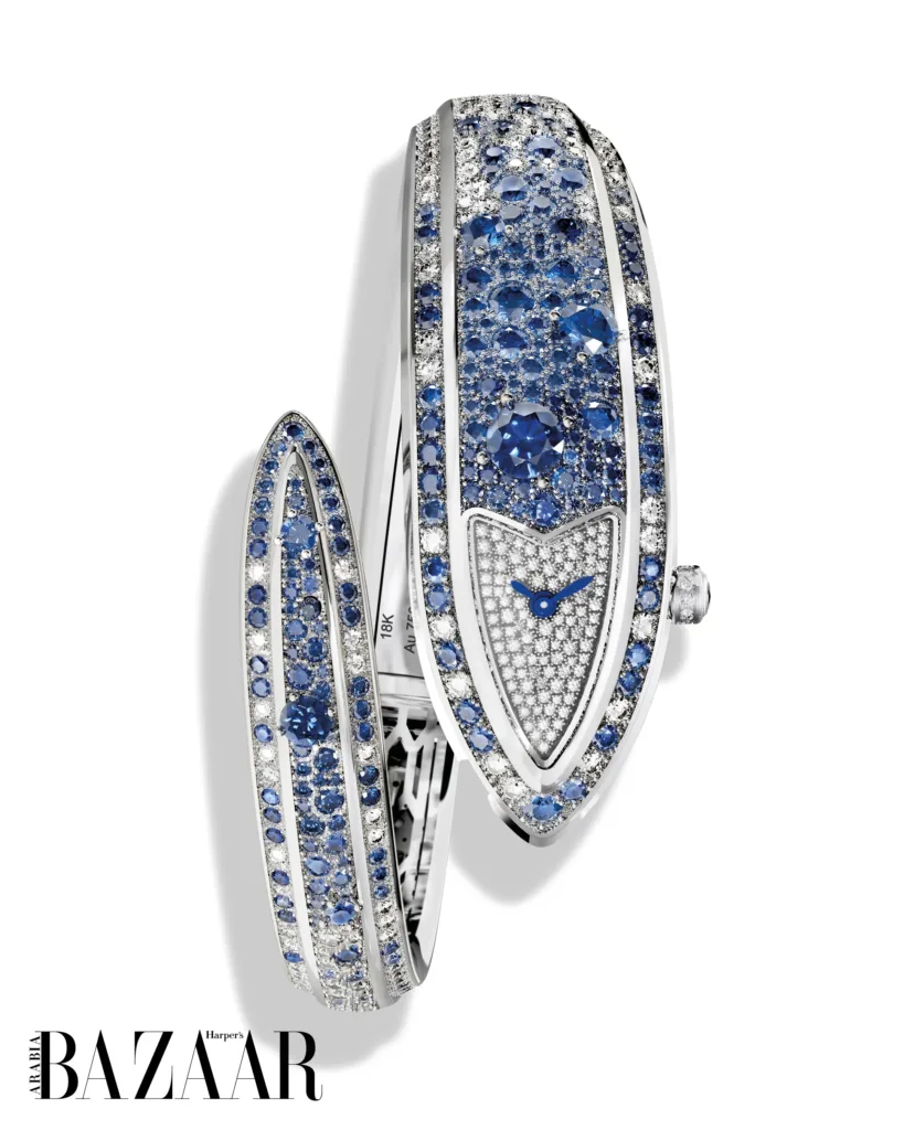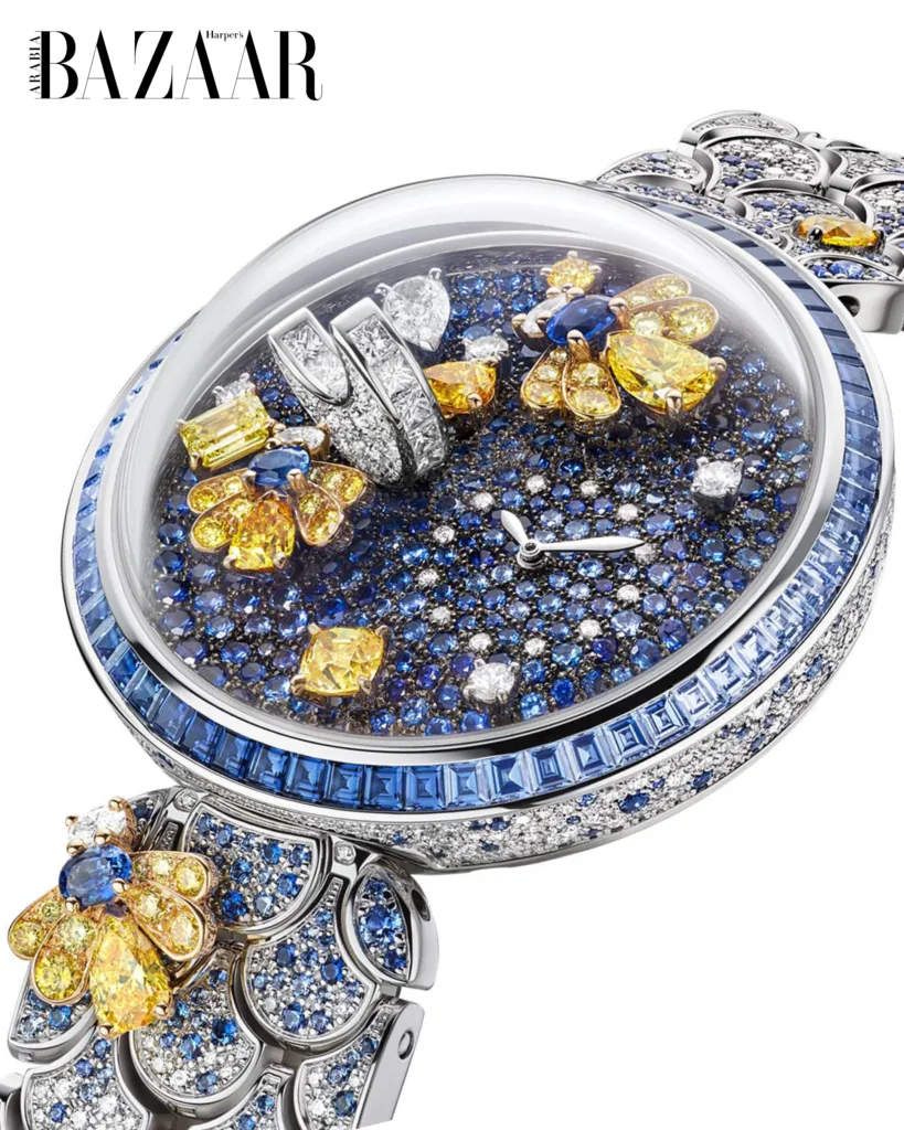 As the sun dips below the horizon and night unfurls, Notte Stellata Diva (“Starred Night Diva”) takes the stage, a lyrical tableau of fireflies, their gem-set bodies “en tremblant,” flitting across a nocturnal sky of blue sapphires and diamonds, all beneath a domed crystal that pays homage to Bvlgari’s beloved cabochon cut.