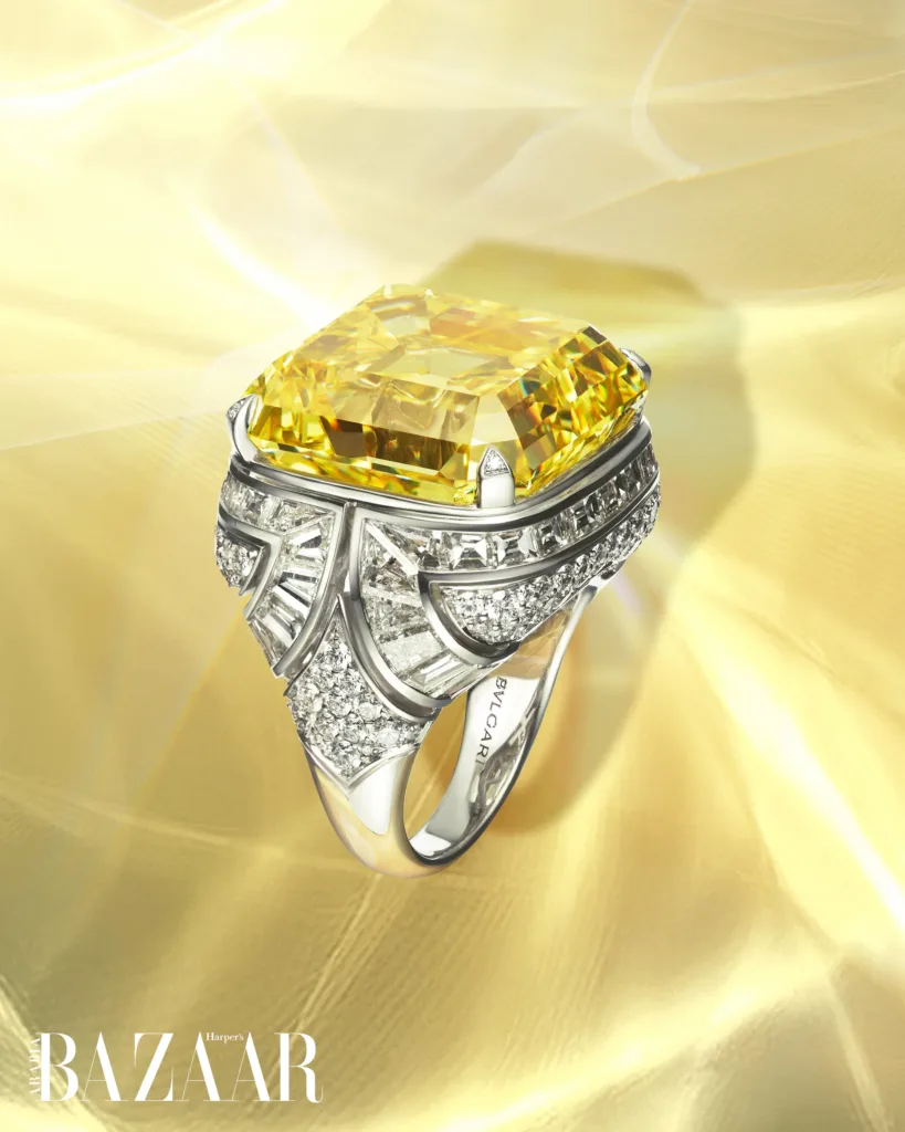 The selection also includes Essence of Yellow, a reinterpretation of Bvlgari’s 1928 Trombino ring, starring a 45-carat fancy vivid yellow diamond so rare it appears once in eight million stones, cut in a bold Asscher style to magnify both its colour and architectural purity.