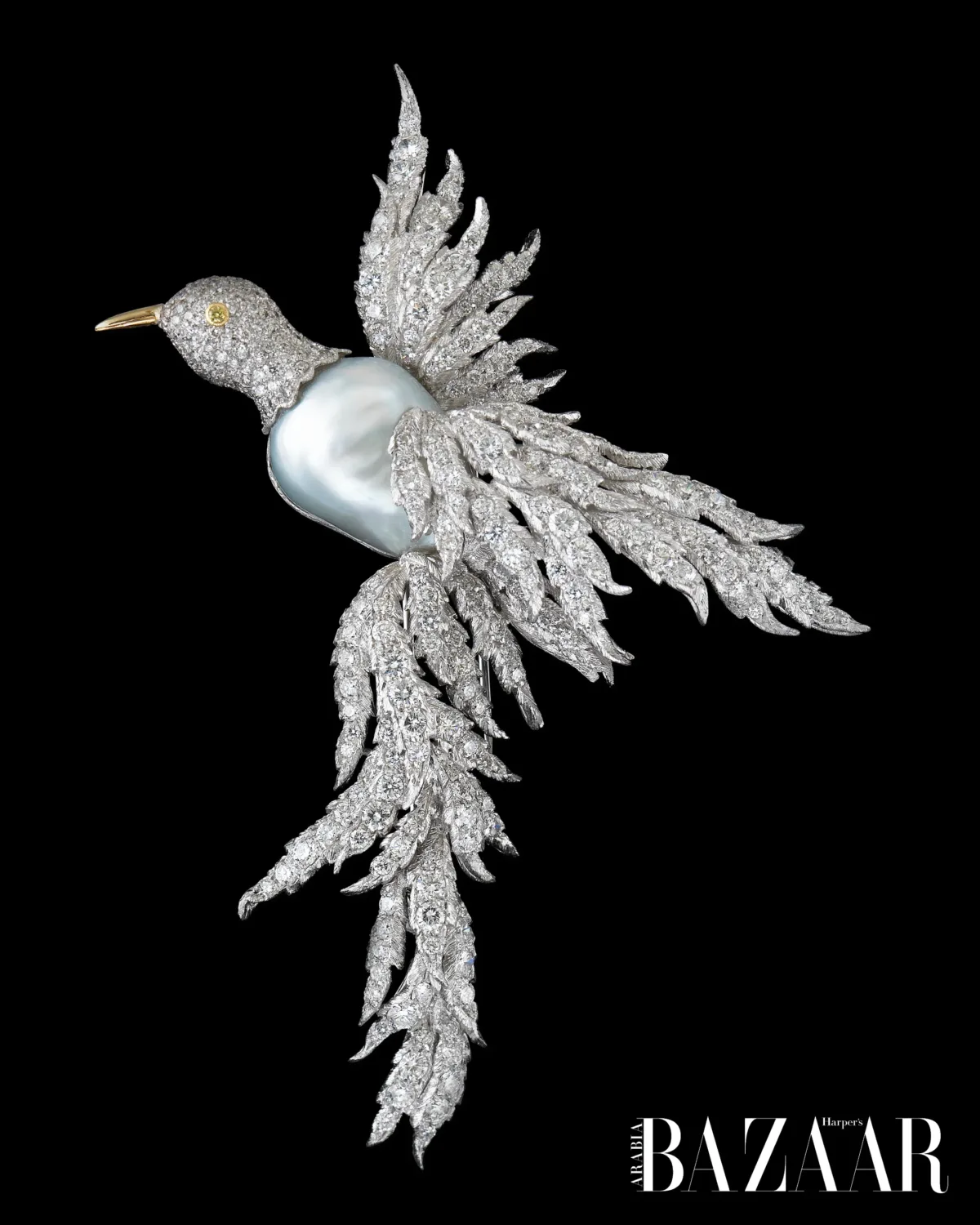 During the Second World War, avian jewellery took on an overtly political role. In German-occupied Paris, Jeanne Toussaint – Cartier’s formidable creative director – collaborated with designer Peter Lemarchand on the now-legendary “caged bird” brooches. In one version, a brightly feathered bird languished behind golden bars, a discreet but defiant protest against Nazi rule. After France was liberated, Cartier released the same design again, this time with the cage door flung open, the bird emerging triumphant.