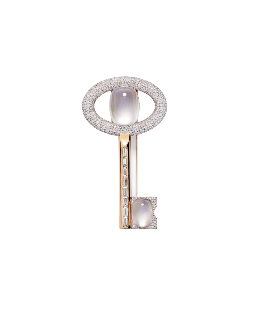 The key is a symbol of love and luck and a promise to open new doors. A family heirloom in the making, this Key to The Moon brooch is a fitting piece to start your new jewellery collection as Mrs. Encrusted in diamonds and featuring two white opals, add this memento to your gift list.