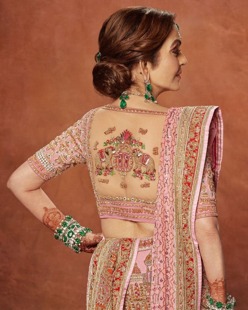 On the reverse, the jewelled blouse features hand-embroidered Jhumkaas and auspicious elephant motifs, while on the borders of the ample skirt, the names of Nita’s children and grandchildren are delicately stitched. Once more showing her love of emeralds, Nita wore a suite of staggeringly large emeralds from her personal collection, designed and crafted by Indian mast jeweller Viren Bhagat.