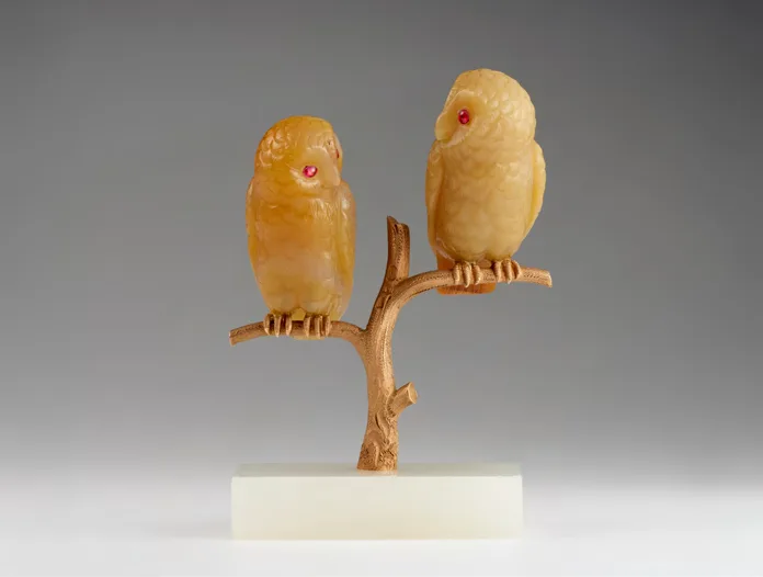 As a potent symbol of power and protection in Gulf heritage, the falcon does indeed dominate the exhibition’s section dedicated to birds of prey. Its bounty contains some extraordinary examples of savoir-faire, including an exceptional brooch by master jeweller JAR, which depicts a falcon’s head with a collar adorned with citrines and garnets. A precious falcon sculpture crafted by Cartier in the 1970s is brought to life in silver, gold and natural citrine, resting on hand-carved verdite with its head covered by a feathered hood, while a contemporary piece by Buccellati represents another ultra-naturalistic falcon in silver.