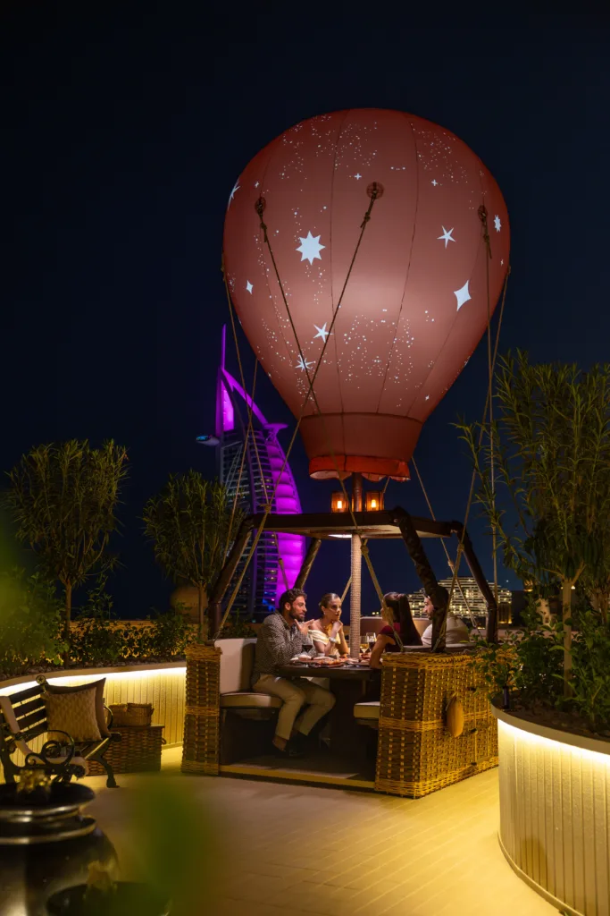 Each balloon is curated to feel like a floating majlis, an intimate space able to house small groups of 2-6 guests, dappled with celestial motifs that speak to the skies above. From the terrace’s unique positioning overlooking the ocean guests can enjoy panoramic views of the Gulf, the iconic Jumeirah Burj Al Arab, and the city’s twinkling lights.