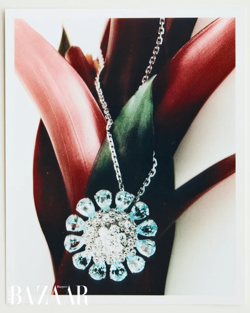 Fleurs d’Hawaï Secret Watch in White Gold with White Mother-of-Pearl, Aquamarines and Diamonds, POA, VAN CLEEF & ARPELSL’Heure du Diamant Earrings in White Gold with Rubies and Diamonds, POA, CHOPARDAnniversary Love Necklace in White Gold with Diamonds, POA, RECARLO
