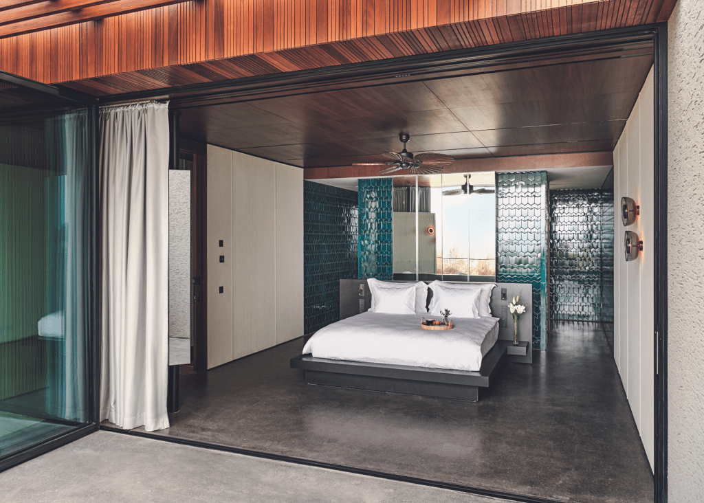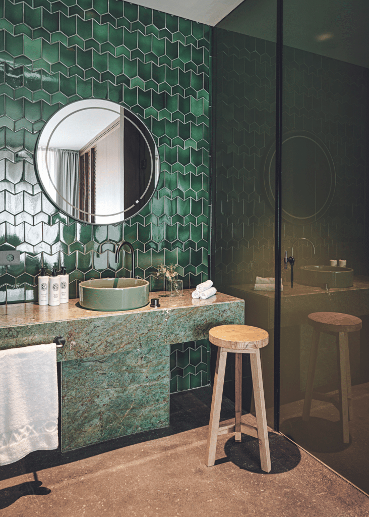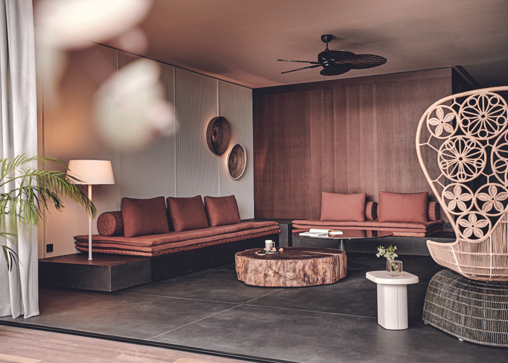 Sustainably minded, the resort’s interior design codes rely on natural stone, warm wood tones and textured neutrals, with the occasional streak of plum and chartreuse. Every inch feels elevated yet understated, refined but not ostentatious.
